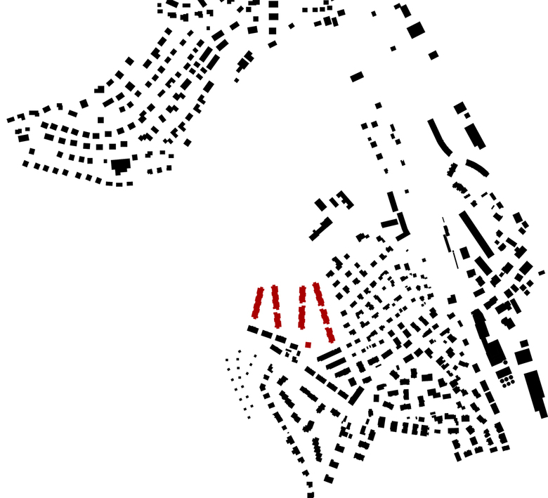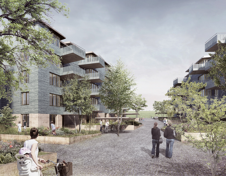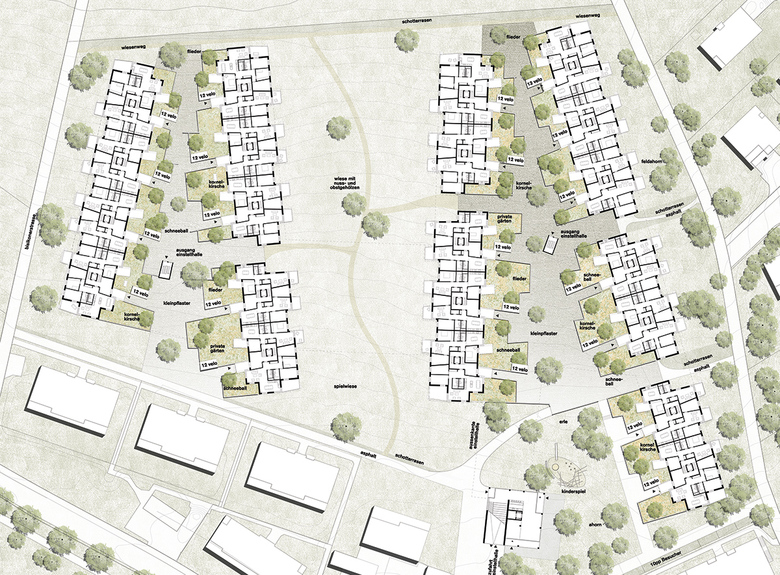 Der gefasste Raum zwischen den jeweils zwei Hausreihen dient der Erschliessung sämtlicher Häuser und wirkt als starker gemeinschaftlicher Aussenraum. Er ist stimmungsvoller, autofreier Lebens- und Spielraum für die Nachbarschaften. Hier kann Öffentlichkeit, Begegnung, Kommunikation, Kinderspiel und vieles mehr stattfinden.
