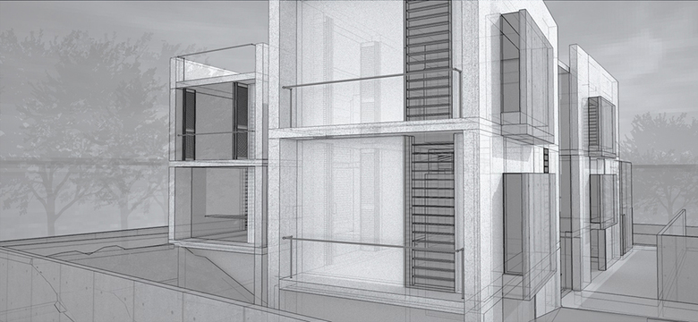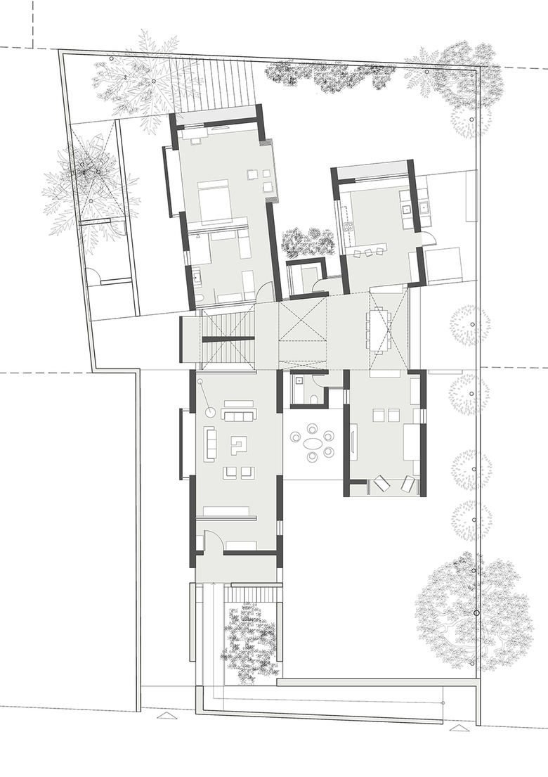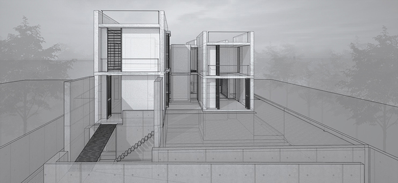 The house per say is elevated due to high flood levels of the river close by, leaving lower spaces for parking, services, home office and guest lounge. There are four wings defined by plain parallel walls and flat slabs that sprawl out into the surrounding raised and sloped garden. This brings the sense of being on ground to the upper floors. The northern wings are larger than the southern wings in size and volume to give advantage of predominant southern sun and breeze to each of the spaces. The large volumes cater to the formal and elaborate functions and the small volumes, to the casual and personal activities. All the spaces are connected through a tall wedge shaped space that distinguishes itself as a space for transition by way of materials and structure that differs from the stable form of the living areas, lending the sense of pause.