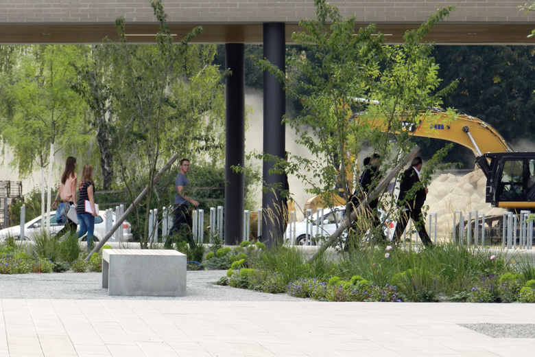 Fahrradabstellanlagen und Stellplätze sind den Gebäuden zugeordnet. Altbaumbestand konnte erhalten werden. Proportionen, Bepflanzung, Farb- und Materialwahl der Aussenanlagen ist abgestimmt auf den Hochbau.