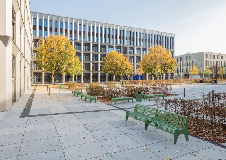 Ausgehend von den Achsen der Fassade ist ein Raster aus Grünflächen und Plattenbelägen geschaffen, in das sich die unterschiedlichen Nutzungen integrieren.