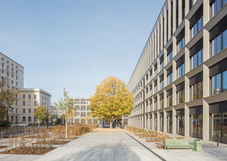 Obwohl zahlreiche Bäume für den Neubau und die umfangreiche Medienverlegung gefällt werden mussten, konnten im Hof einzelne große Bestandsbäume erhalten werden. Dazu gehört eine große Robinie und drei Silber-Linden. Sie werten gemeinsam mit den grünen Kuben der Heckenblöcken und den Neupflanzungen den Innenhof nachhaltig auf.