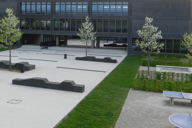 Die Außenanlagen für den Neubau der staatlichen Realschule gliedern sich in drei Bereiche, den durch das Gebäude gefassten Pausenhof, den linear ausgerichteten und kompakten Sportbereich, sowie den Vorplatz auf dem die Baukörper stehen. Der Pausenhof versteht sich als Kontinuum des Schulgebäudes. Die hell gepflasterte Fläche ist durch Plattenstreifen und Sitzgelegenheiten gegliedert, die sich aus dem Fassadenspiel ableiten. SolitärBäume markieren den Hof und die Freifläche. Umgeben ist die befestigte Pausenhoffläche von Aufenthaltsbereichen die durch Hecken gegliedert, dem Spiel, dem Lernen und der Erholung dienen. Die Sporthalle und Sportfelder grenzen alle an die Nordsüd verlaufende Erschließungsachse, die mit einer Baumreihe aus Säuleneichen gekennzeichnet ist. Der Vorplatz mit Eingangsbereich und Erschließungsflächen stellt sich als gepflasterte und funktional gegliederte Fläche den gestellten Anforderungen.