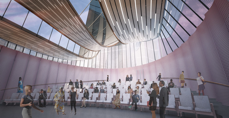 Designed as a beacon in the landscape, that announces it's important mission, the new tower embraces the old building in fluid ribbons of high-performance concrete. A key feature of the interior is a vertical light sculpture that was to be designed and made by girls from underprivileged communities in on-site fabrication workshops bringing sunlight from the roof into the depths of the former prison.