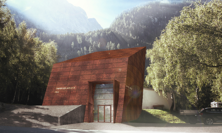 Hinsichtlich unserer konzeptionellen Vorstellung von Form, Raum und Verwitterung schwebt uns für diesen Ort am besten roher Stahl vor. Als Kontrast dazu setzten wir im Innern Holz ein. Holz, Beton und Stahl sind Baustoffe, die in Grundformen wie Tanne, Kies, Sand, Kalk oder Eisenerz unmittelbar in der Region zu finden sind.