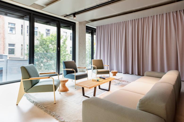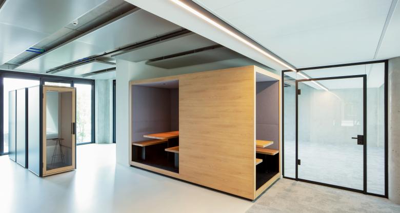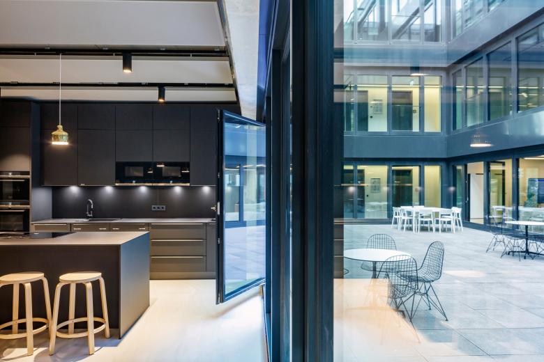 Eine weitere Besonderheit stellte die Hanglage der Max-Urich-Straße dar. So erhielt das Gebäude von uns zwei Erdgeschosse und eine interne Treppe als Verbindung. Während die Obergeschosse mit modernen Büroflächen in vielfältigen zeitgemäßen Formen ausgestattet sind, gibt es in EG1 und 2 ein Café und einen großen Küchenbereich zur Selbstnutzung, einen Fitnessbereich sowie Veranstaltungsräume mit Bühne und Bar – alle nur intern für die Mieter.