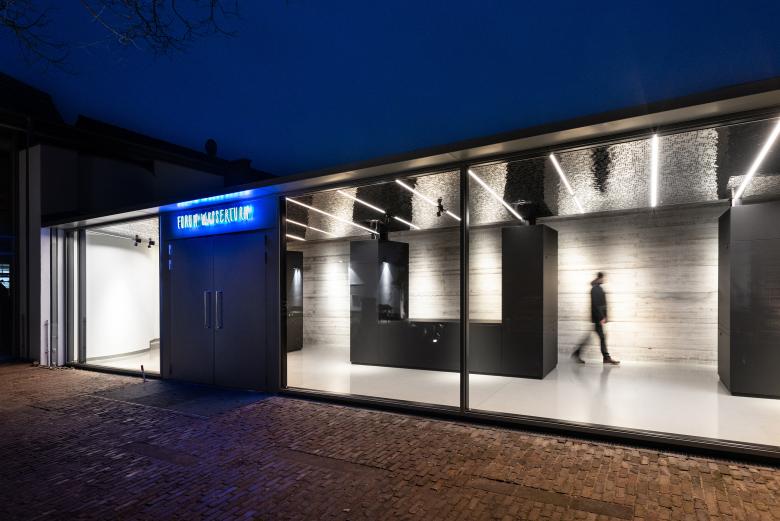 Die Innengestaltung des Foyers überrascht sowohl gestalterisch wie funktional. Ästhetisch sorgen eine rohe Sichtbetonrückwand, ein heller, glatter Estrich und eine reflektierende Decke aus gelochten Edelstahlblechen mit eingelassenen LED-Linien für spannende Kontraste und Reflektionen. „Als funktionale Elemente haben wir drei raumhohe Einbaumöbel entwickelt, die gleichzeitig die Gebäudestützen verkleiden“, erzählt Christian Hein. Das mittige Möbelstück bildet einen multifunktionalen Empfangstresen, der nicht nur zwei integrierte Getränkekühlschränke und Schwerlastschubladen für Getränkekisten enthält, sondern auch auf beiden Schmalseiten durch ausziehbare Teile erweitert werden kann. Die beiden äußeren Möbel dienen als Garderoben – und können auf ihren Rückseiten als Galerieflächen für Ausstellungen genutzt werden.