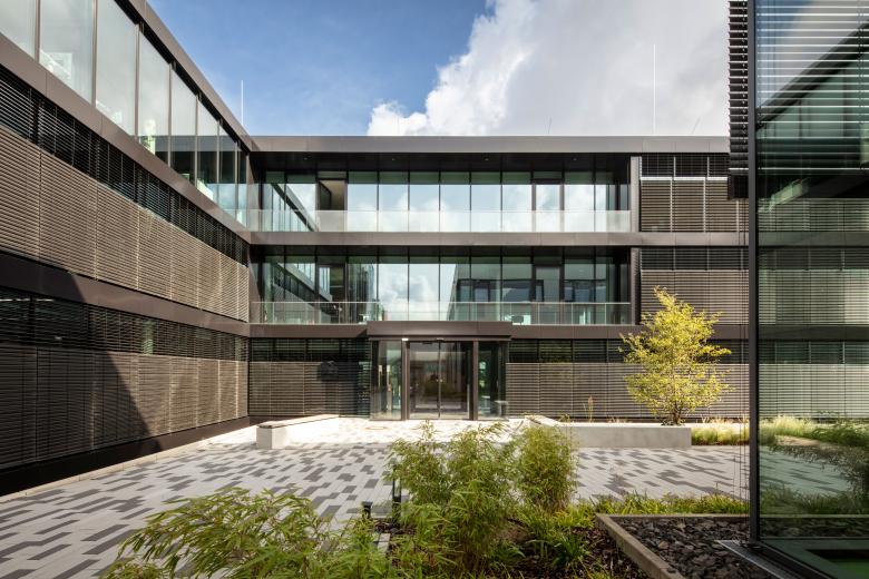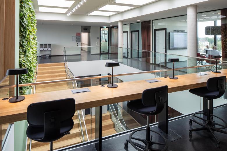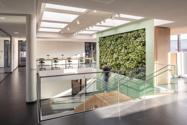 Im Inneren befindet sich im Gelenk des L-Grundrisses ein über alle Geschosse offener Bereich mit einer breiten Sitztreppe zwischen EG und 1. OG. Es ist das kommunikative Zentrum des Hauses, durch große Oberlichter mit Tageslicht versorgt. Besonders prägend sind hier das helle Holz der Treppen und große, vertikal begrünte Wandflächen. In den beiden Flügeln liegen dann moderne Arbeitswelten nach einem Open-Space-Konzept, zu dem auch Besprechungsnischen, Telefonboxen oder Think-Tanks gehören. Zum erweiterten Raumangebot gehören neben Besprechungsräumen auch ein Yogaraum sowie ein Tischtennisraum – mit Blick über die Felder und die grüne Umgebung. Auch das gehört zu New Work.