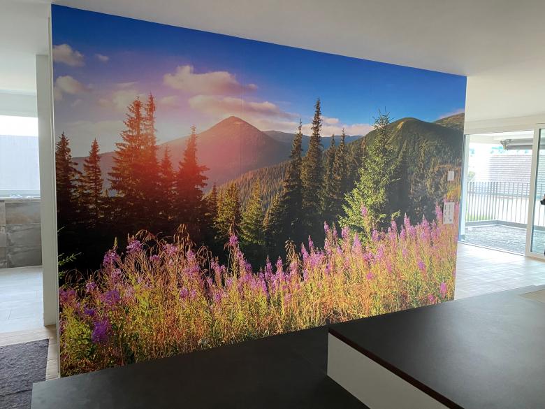 Die Umgebung gestaltet sich aus harten Flächen. Ein Vordach definiert den Raum für die Fussgängererschliessung. Die übrigen Flächen, wie auch das Tiefgaragendach werden begrünt. Der Spielplatz befindet sich hangseitig des bestehenden EFH, weit ab von der Strasse. Die Grünflächen werden im Terrassenbereich der Wohnungen mit Rasen und im weiteren Umfeld mit Wiese angesät. Gruppen aus einheimischen Sträuchern und Stauden vervollständigen das Ensemble und dienen der Zonierung wie auch dem Sichtschutz zwischen den Wohneinheiten.