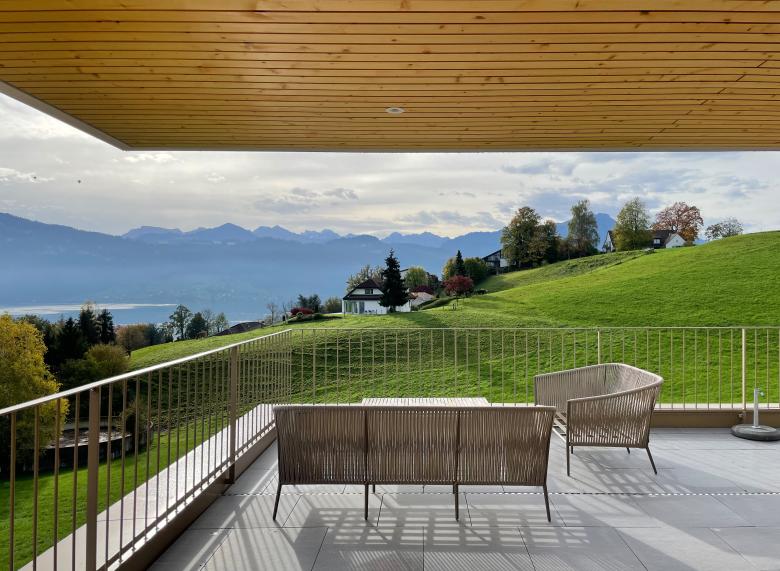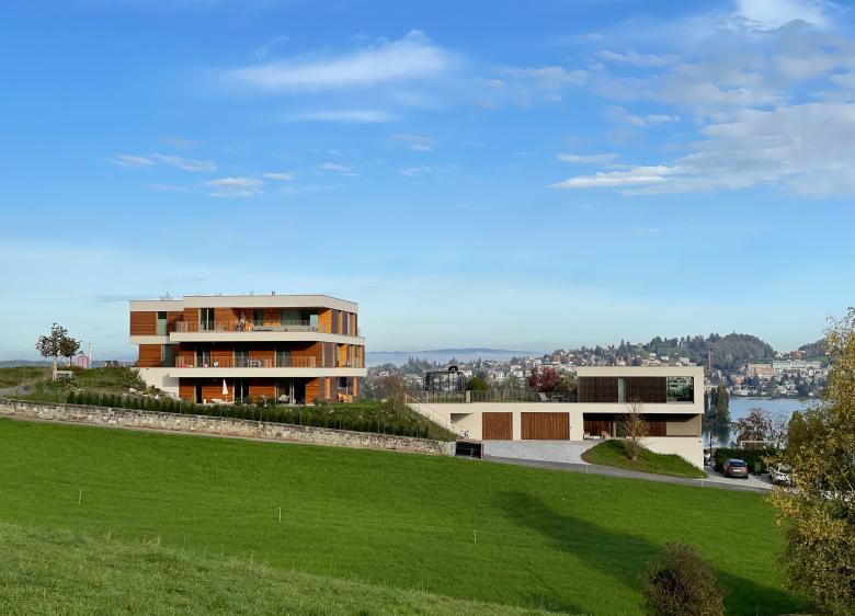 Die Etagen-Wohnungen sind jeweils durch ein zentrales Treppenhaus miteinander verbunden. Die Wohnräume orientieren sich in alle vier Himmelsrichtungen, wobei das Wohn- und Esszimmer jeweils in Richtung See und Stadt Luzern gerichtet ist. Die Orientierung der Balkone und Terrassen in Nord- Südrichtung ermöglicht es, die Aussenräume entsprechend den gegebenen Jahreszeiten und Temperaturen zu nutzen.