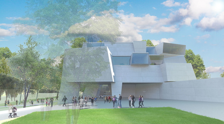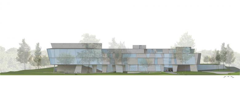 公園に面した北側のファサードを多層構造のガラスのギャラリーにすることで、周囲の風景を自由に見渡すことができ、また公園側からコンサートホールの形を見せることができます。このファサードの彫刻的な幾何学形状は、ガラス、柱、壁の変動により、小さな断片に分割され、全体のスケールを縮小し、軽快さを増すと同時に、ダイナミクスを与えています。