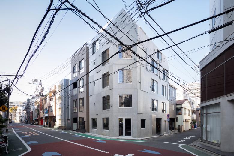 東京の中心、港区白金に建つ集合住宅・店舗・事務所の複合ビルのプロジェクトである。敷地は、古川の南に延びる五の橋通りの四差路角地に位置する。