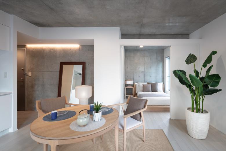 各住戸は、ワンルームから1ベッドルームタイプで、正方形に大きく象った開口部により空間のひろがりや光、風の入り方などに配慮した計画となっている。住戸は無駄をそぎ落としたシンプルなデザインと、多様で自由度の高い空間構成を実現させるため、1LDK以上の広さの住戸ではベッドルームとリビングルームの仕切りは、可動壁とし連続して一体的に使用出来ることも可能としている。また素材のコントラストを際立たせるため、白色壁とコンクリート打放し壁の構成としている。それぞれの住まい手により、リビング、ダイニング、ベッドルームを自在に変化させることが出来る空間関係となっている。