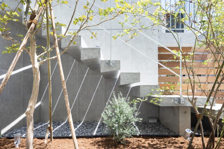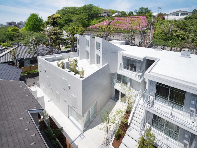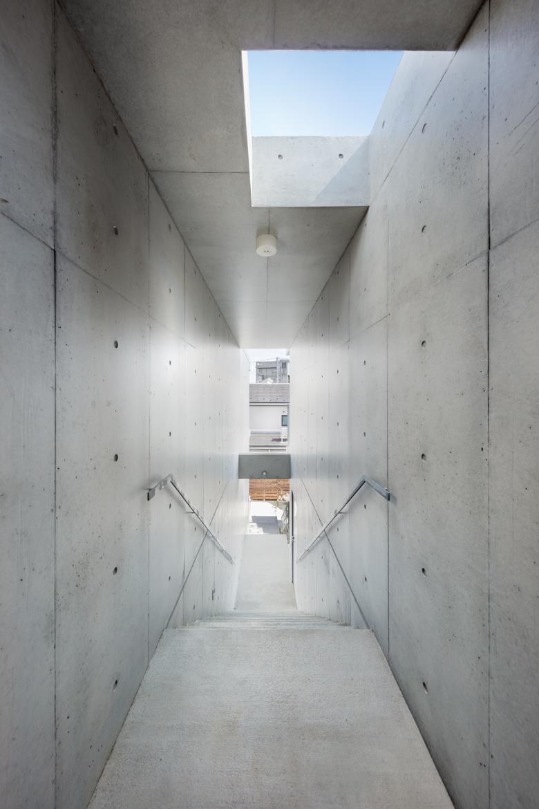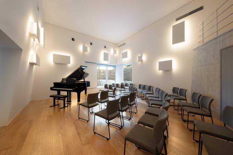 東京の南側、五重塔でも知られる池上本門寺の麓が敷地である。この地に居住しながら音楽練習、勉強、鑑賞、創作、発表も出来る多様な音楽生活の活動空間構成を提示すると同時に、建築空間が時間、利用いよって異なる構成がハイブリットに組み合わされる新たな建築の構成を計画した。建物形状は、この敷地のジオメトリに沿って拡がりをもたせた形状とし、西南部分に計画した音楽ホールを内外で回遊する空間をつくり起伏のあるランドスケープ空間としてアプローチ・ホワイエ・エントランスホールを形成している。この回遊空間上部に南北軸にずらした山なりの地形を感じさせるボリューム形状の居住空間がまたがる形とした構成がこの施設の象徴でもある。回遊空間から一歩奥に入ると、参道の主階段を彷彿させるような象徴的なメインアプローチ階段を設けており、防音賃貸住宅、オーナー住宅のプライベートなゾーンを計画している。