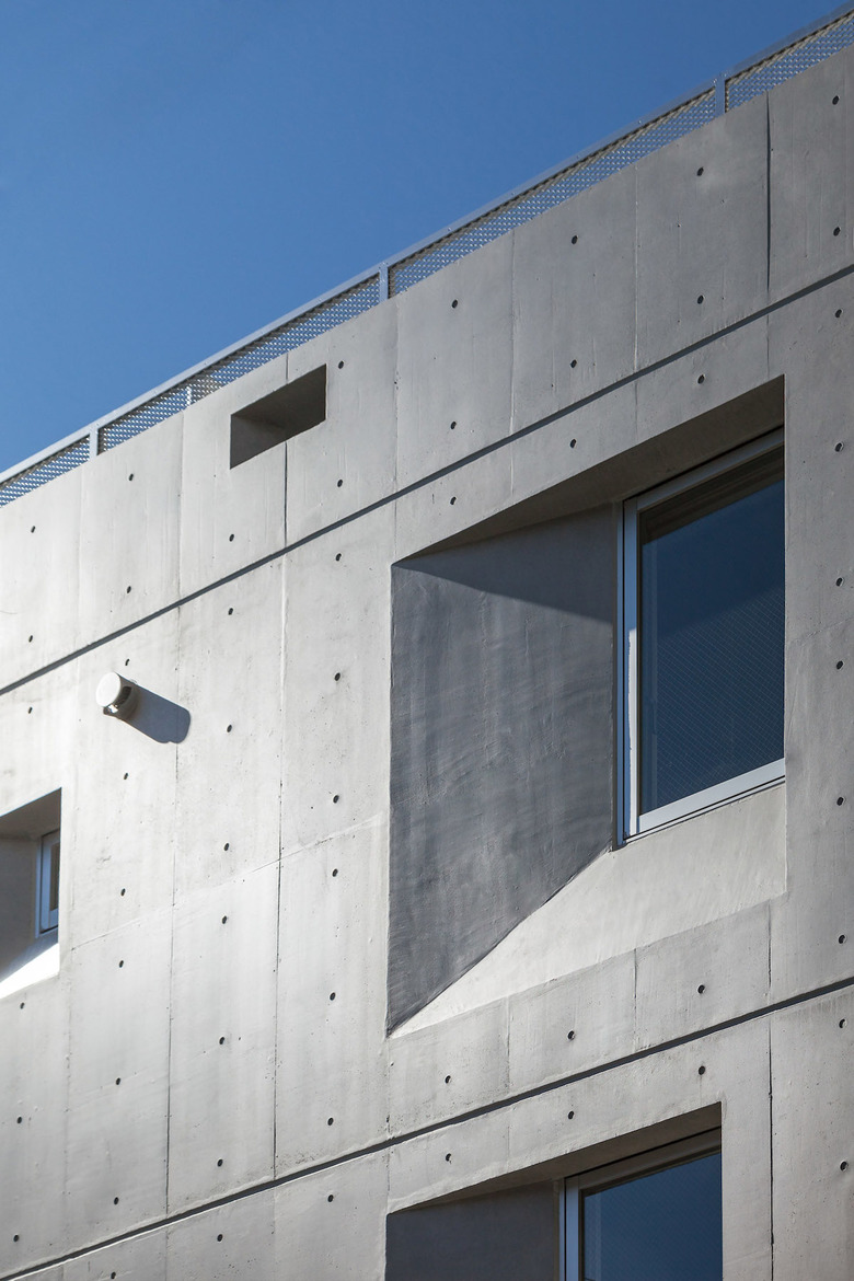 敷地周辺は細い道路を介して戸建て住宅が立ち並ぶため、近隣住民との視線交錯を避けるように開口を少しずつシフトさせた。この開口配列により光や風、風景を取り込みつつコンクリートという重たい素材に軽やかさを与えた。