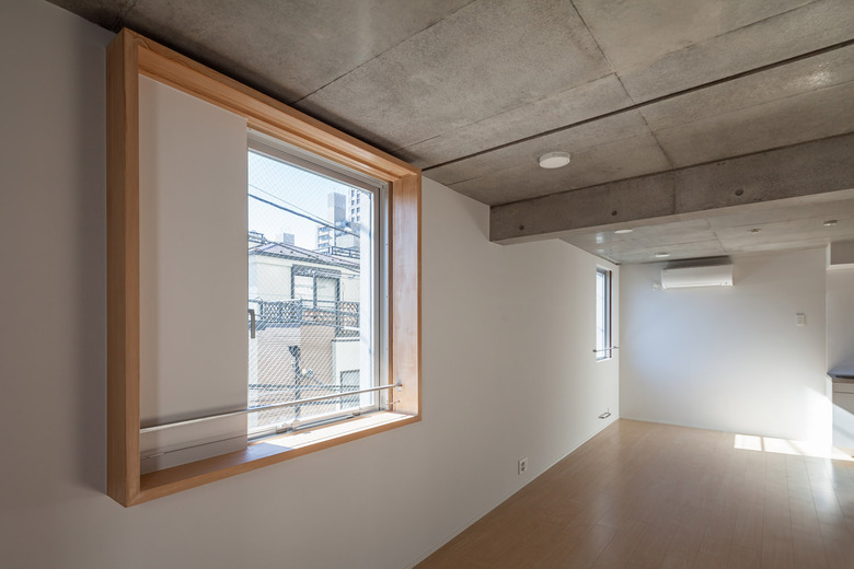 住戸内部は白い壁とコンクリート打放しだけで構成。無駄をそぎ落としたシンプルなディテールと仕様を徹底した。集合住宅に於ける最小限の形を追求し、モノに支配されない豊かさ、持たない生活の形、つまりライフスタイルと直結したミニマリズムを提案した。提供された最小限の要素は、住み手の自由な暮らし方のきっかけとなるだろう。例えば自立壁だけで仕切られた収納スペースはコンパクトな書斎にもなるし、広いコンクリートのキッチンカウンターはデスクなどにも利用できる。