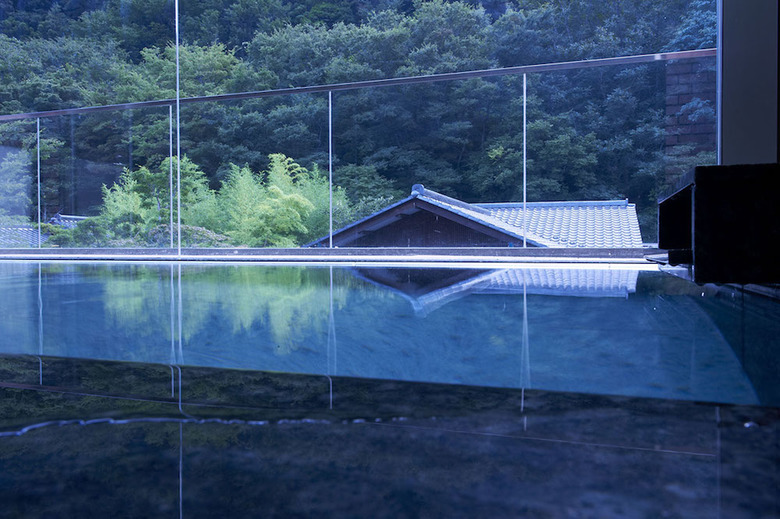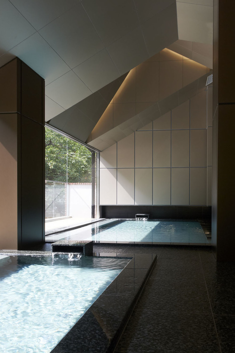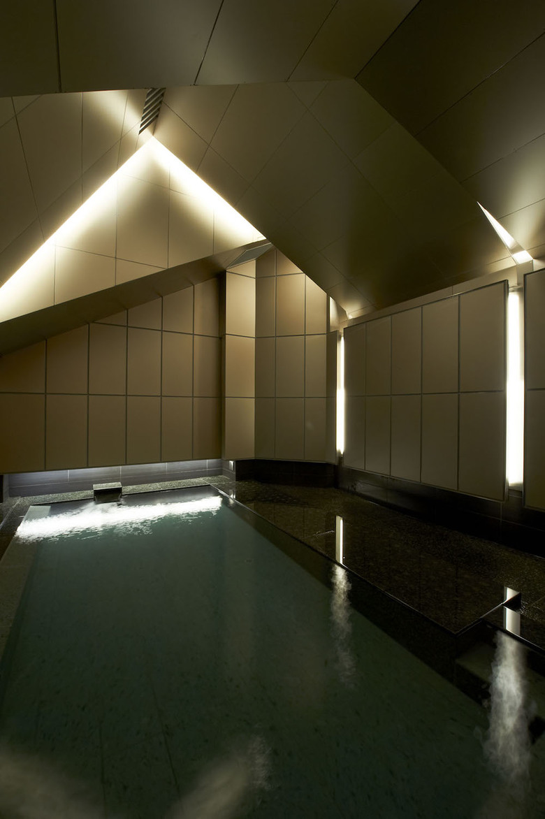 施主は、東日本大震災後にリノベーションを決断して、震災5ヶ月目の8月11日にリニューアルオープン。よもぎ山に面し四季のそれぞれの借景を楽しむことが出来る。よもぎ山といくつかの離れ宿の建物とどのように関係を持たせるかということがひとつの大浴場のテーマとなりました。山の形状および離れ宿の建物の屋根形状は、温泉の水面に映りこみ、それは内壁および天井の形状と重なり合う。内装仕上は、耐季節性の高いアルマイト処理によるブロンズ色アルミニウム・パネル。