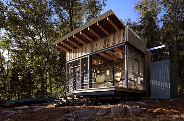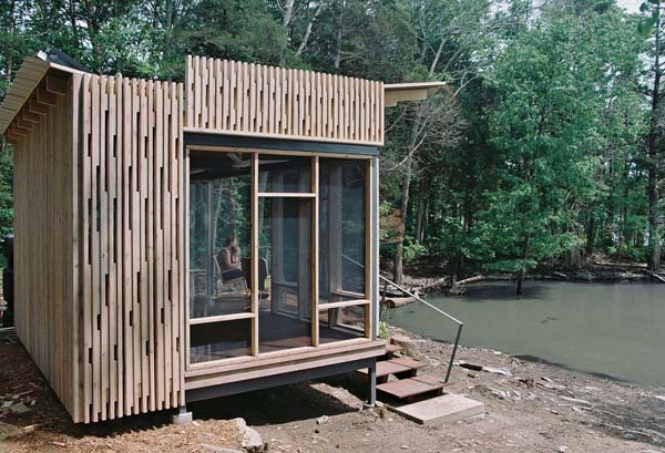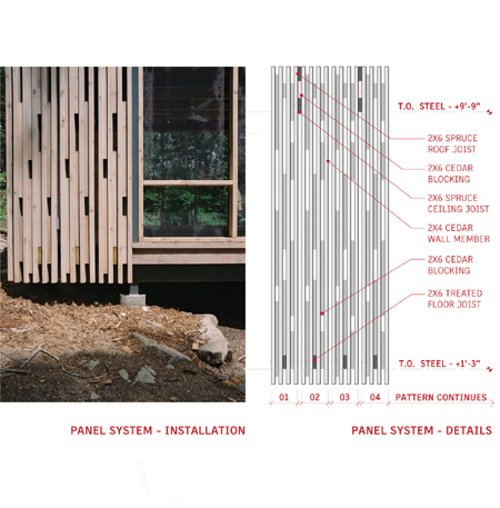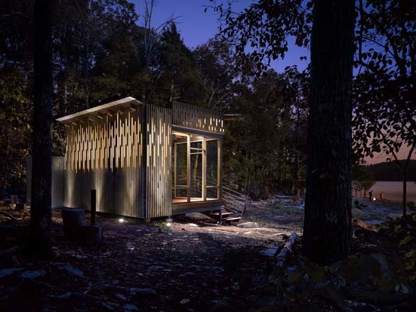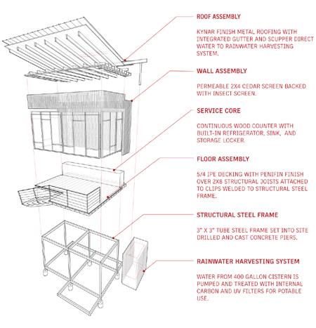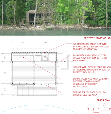 The Owners commissioned Sanders Pace Architecture to design and coordinate construction of an off-the-grid lakeside pavilion with integrated water reclamation and photovoltaic technology for weekend use. A lightweight steel structure was chosen for durability and ease of fabrication. This structure was shop fitted with tabs to allow for the attachment of a secondary skin. In developing this skin the desire for transparency coupled with a passive cooling approach led to a shop fabricated structural screen of 2x4 vertical cedar boards backed with insect screen. Structural blocking located between the vertical structure lends a delicate pattern to the structural skin camouflaging the structure within its densely wooded setting. Towards the water view the cedar skin dissolves and becomes a series of screen panels allowing unobstructed views to the water and mountains beyond. A single 8'x8' sliding screen panel provides direct access to the water. additionally the cedar screen provides the structure for the butterfly roof above that directs and delivers rainwater to a collection cistern located beside the structure. An internal charcoal filter and ultraviolet light treat the water for potable use. Rooftop mounted photovoltaic cells provide the necessary power to run the water pump, refrigeration, fans and lighting providing for a truly independent overnight living situation.