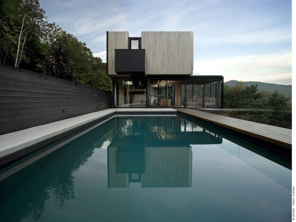 This residence and guest house is located near the ski hills of Mont Tremblant. Pierced in a singular gesture by an oblique interior stair, the main house consists of three bedrooms, living areas, a sauna, a transformable recreation room, and, typical of the region's cottages, a screened outdoor living room. The residence, composed of three superimposed volumes aligned with an entrance-level pool, is placed within a fold in the landscape, creating an intimate exterior space framed by the north façade and a three-meter-high rock outcrop. This location allows for several advantages in terms of exposure to the sun, wind, and the public realm.