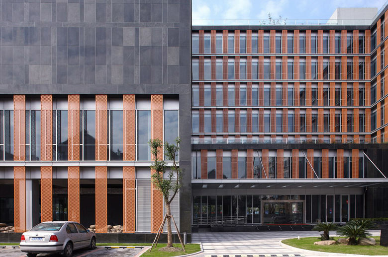 The exterior wall is formed by the transparent sunshade curtain wall and the solid stone panels. These two wall types transpose with each other at corners to reduce the solidity and heaviness of the building mass. More taken as an urban gesture, this sculptural language expresses a friendly scale to the residential context while keeping the building’s own corporate identity.