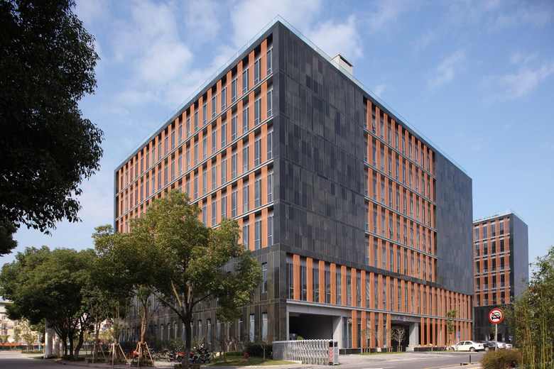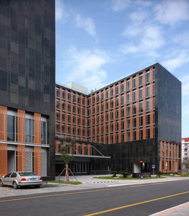 The building is shaped by an “S” volume to gain more south-north surfaces for natural light and ventilation on this east-west oriented site. It gives two semi-enclosed exterior spaces to the project: the east courtyard offers efficient areas for the drop-off and lobby entry while the west courtyard stays on the third floor to provide a quiet outdoor garden for the tenants of the offices. A linear staircase in the double-height lobby links these two courtyards vertically to create more opportunities for public activities.