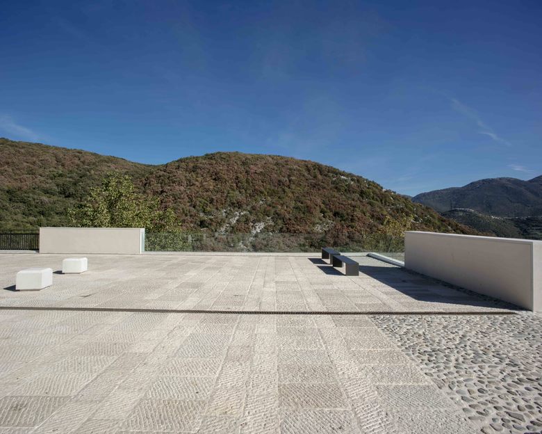 La pietra chiara locale definisce l’intera pavimentazione della piazza, fino ad incontrare i ciottoli che provengono dal centro del paese e delineano casuali camminamenti. Alcune sedute cubiche in pietra bianca ritmano adagio lo spazio e tracciano ombre lineari amplificando l’essenzialità geometrica della piazza.
