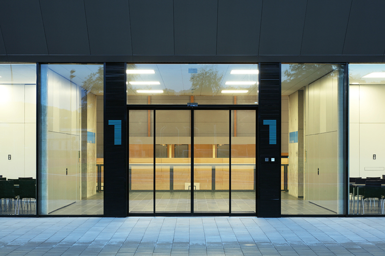 Die Zeichenhaftigkeit des Gebäudes wird adäquat auf das Erscheinungsbild in der Nacht übertragen, indem das Belichtungskonzept umgedreht wird und sowohl das Glasband als auch das Portal gleichmäßig von innen erhellt wird.