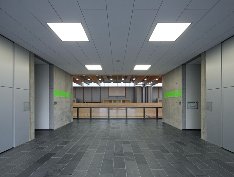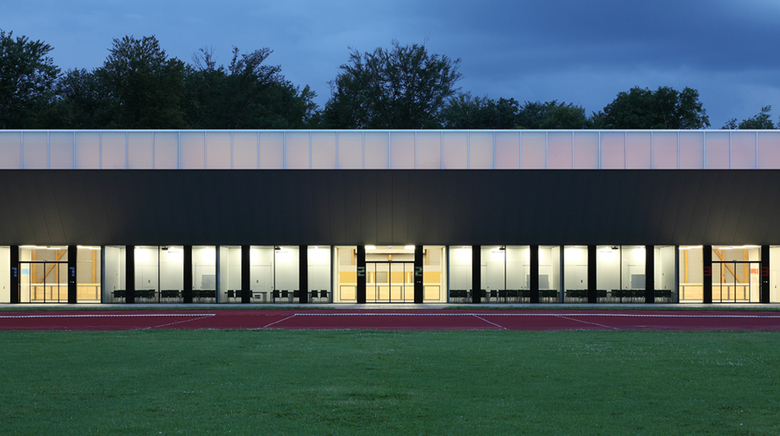Aus den städtebaulich-topographischen Gegebenheiten, der Optimierung der Trainings- und Wettkampfbedingungen sowie der Erlebbarkeit des Sports durch die Zuschauer entstand ein kompakter Baukörper als Abschluss der Sportanlage. Wesentliche Gestaltungselemente sind die horizontale Schichtung des Gebäudes in einem weitgehend geschlossenen Körper mit einheitlicher Gebäudehülle, der über zwei Geländeniveaus in die Topographie eingebettet ist. Die konkave Gestaltung des Eingangsbereiches führt den Blick des Betrachters zum Wesentlichen des Gebäudes. Ein transluzenter Lichtgaden verleiht dem Gebäude Leichtigkeit und leuchtet den Hallenraum blendfrei aus.