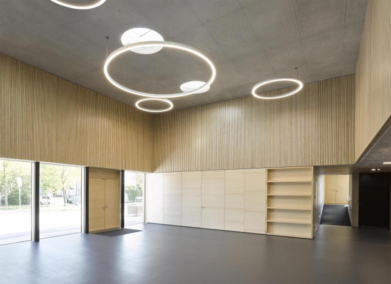 Im Vordergrund steht der architektonische Raum mit hochwertigen Oberflächen und einer dezidierten Lichtführung. Wie die Auskleidung einer Schatulle sind Foyer und Saal mit akustisch wirksamen Wandbekleidungen ausgeschlagen. Die Intimität dieser Räume wird durch die Beschränkung der verglasten Flächen auf das Erdgeschoss verstärkt. Gleichzeitig ermöglichen diese vielfältige Blickbeziehungen mit dem Außenraum und den Erschließungszonen.