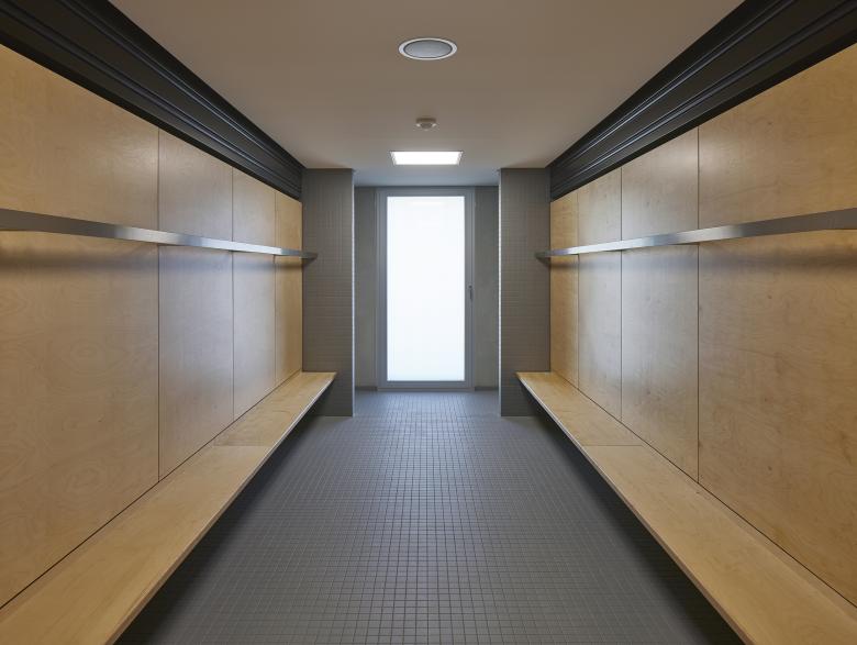 Der natürlichen Belichtung der Umkleide- und Duschräume über Aluminiumfenster ist ein Screen aus Bauprofilglas als Schutz vor Einblicken vorgelagert.
