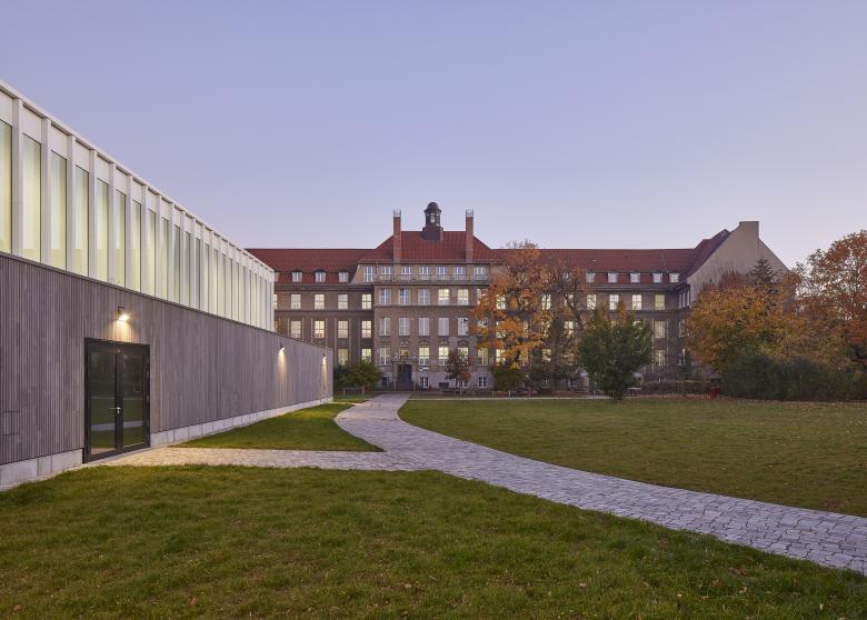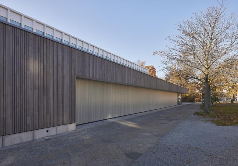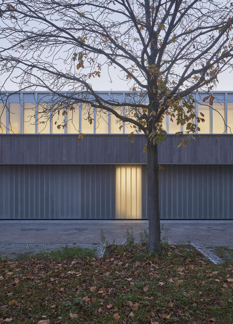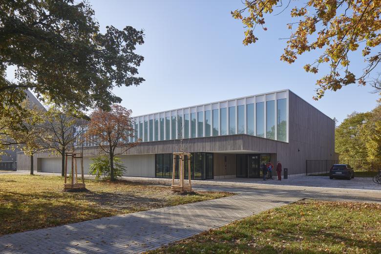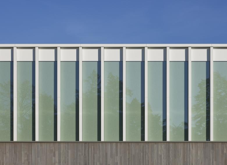 Die Außenwände der Erschließung und eines Mehrzweckraums bestehen ebenfalls aus vertikal gegliederten, raumhohen Holz-Alu-Fassadenkonstruktionen, hier mit transparenter Wärmeschutzverglasung.