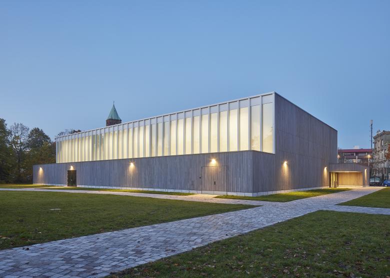 Aus der Verteilung in zwei unterschiedlich tiefe Nebenraumzonen entlang der Hallenlängsseiten ergibt sich im Querschnitt über die von Öffnungen freigehaltenen Giebelwände eine einprägsame Kontur, die in der Asymmetrie ihre Individualität erhält.
