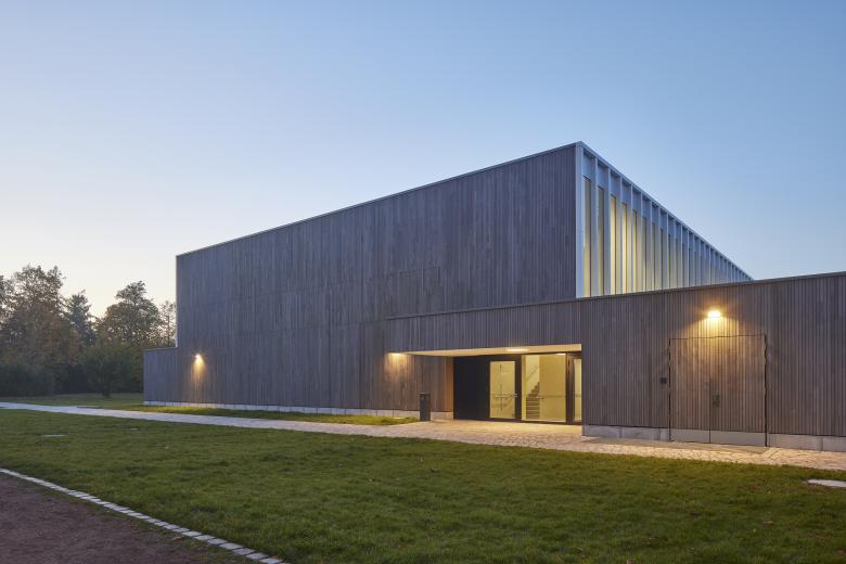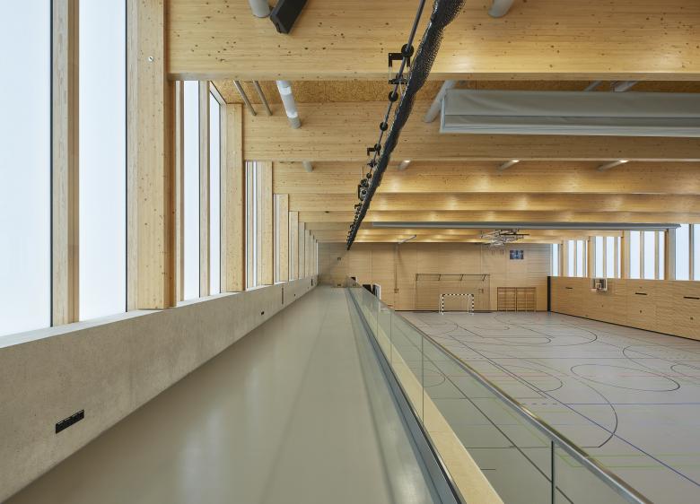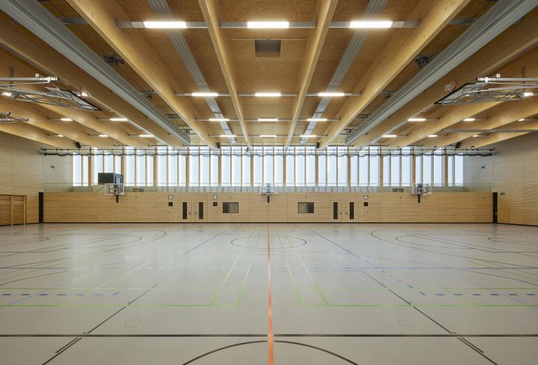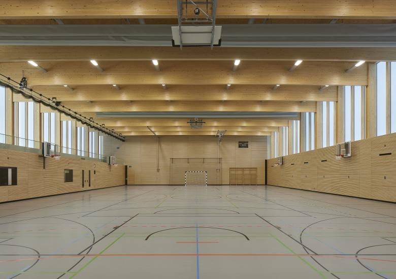 Holz als Baustoff erfüllt sowohl im Ausbau als auch in der Konstruktion und der Fassaden auf ideale Weise die Anforderungen. Im Gegensatz zu Massivbauteilen kommen die Holzbauteile oberflächenfertig auf die Baustelle und müssen nicht mehr nachbearbeitet werden. Der Baustoff Holz trägt im Innen- und Außenraum zu dem unverwechselbaren Erscheinungsbild bei und schafft in der Halle eine visuell warme und angenehme Atmosphäre.