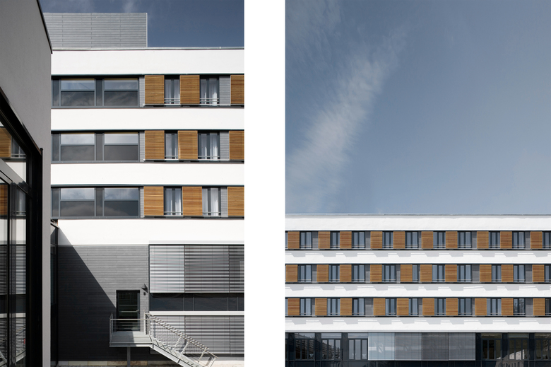 Im bestehenden Pavilliongebäude werden zentral Verwaltung (EG) und Freizeitbereiche (Souterrain) angeordnet. Der nördliche Hof mit Wasser und Grün auf dem Niveau des Frankenstüberls ermöglicht einen Freiraumbezug der Freizeitbereiche. Die Erweiterung nach Süden schafft eine attraktive Verknüpfung von Haupteingang und Mensa, eine zeichenhafte, großzügige Zugangssituation sowie eine klare Freiflächenzonierung. Durch die erhöhte Lage werden Ausblicke ins Tal und ins Grün geschaffen.