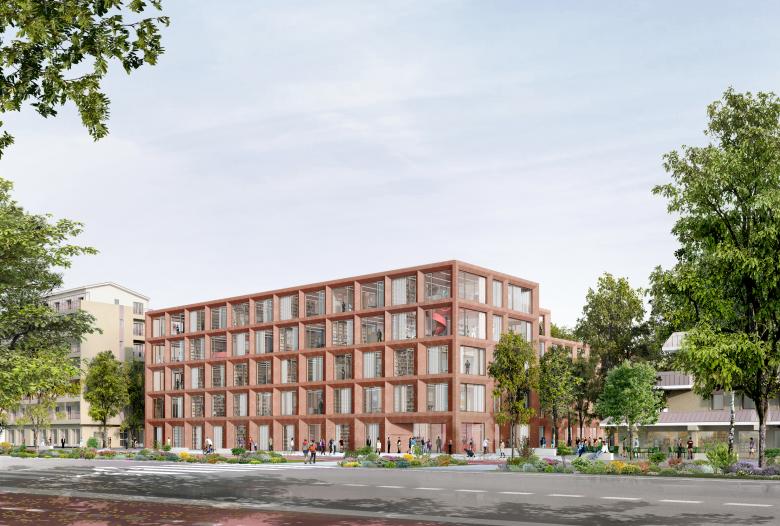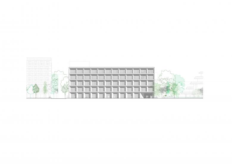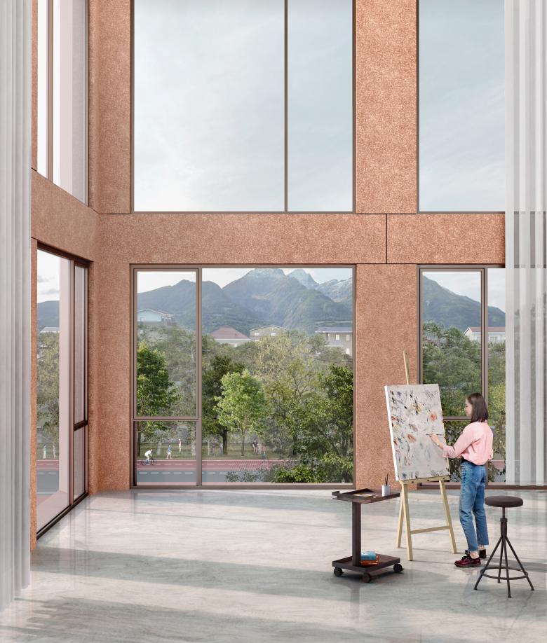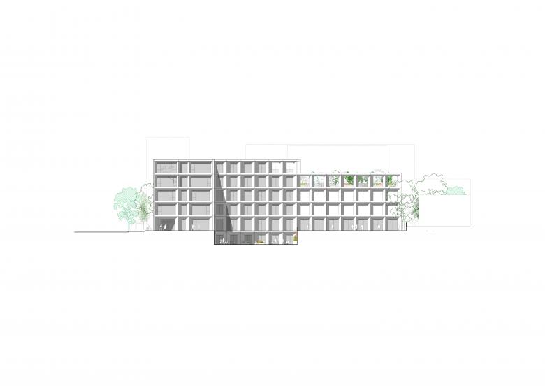The project for the new LICAM is based on the idea of a measured building, with simple volumes and characterized by a facade that plays on the rhythm and proportions of architectural elements. In particular, the facade design is based on different sizes of vertical and horizontal trapezoidal elements that define a frame that shows the structural nature of the building. The shell highlights an alternation of solids and voids where the concrete's materiality contrasts with the glass's transparency and lightness. From the point of view of the materials, the facade is made up of prefabricated elements in brick-coloured concrete like the architecture of the Roman era located near the site, particularly the "Tour Du Pailleron".
