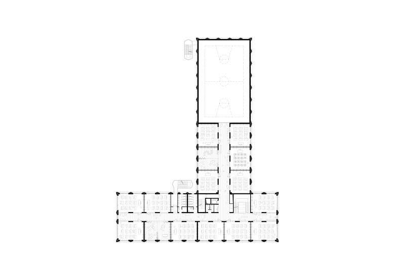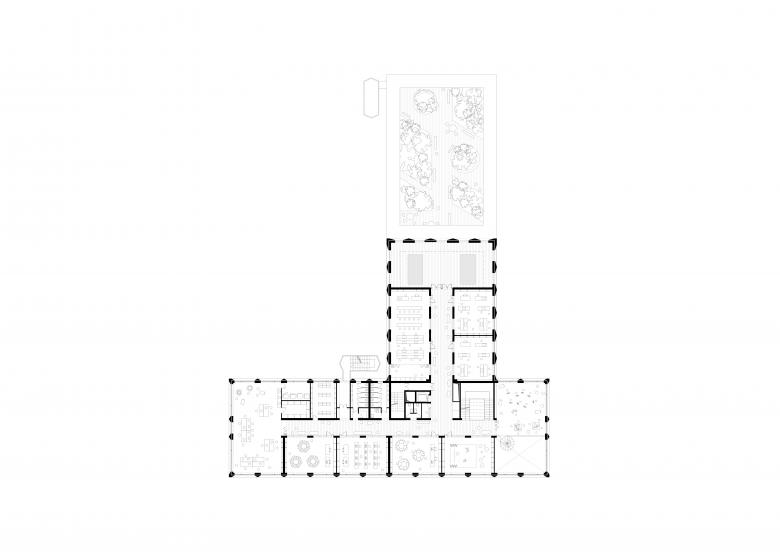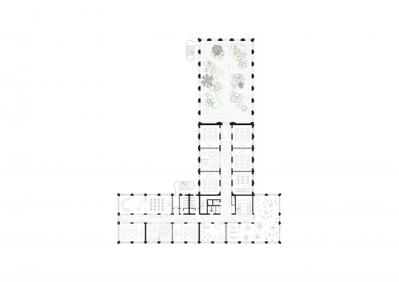 On the third floor, there is a roof garden conceived as a "Hortus conclusus" with the characteristics of an open-air classroom. Vegetation is the protagonist of this place and generates a natural landscape characterized by local tree species, shrubs, small fruit trees and aromatics plants.