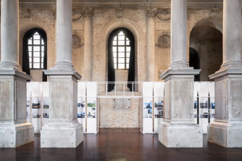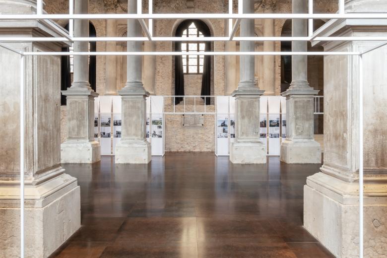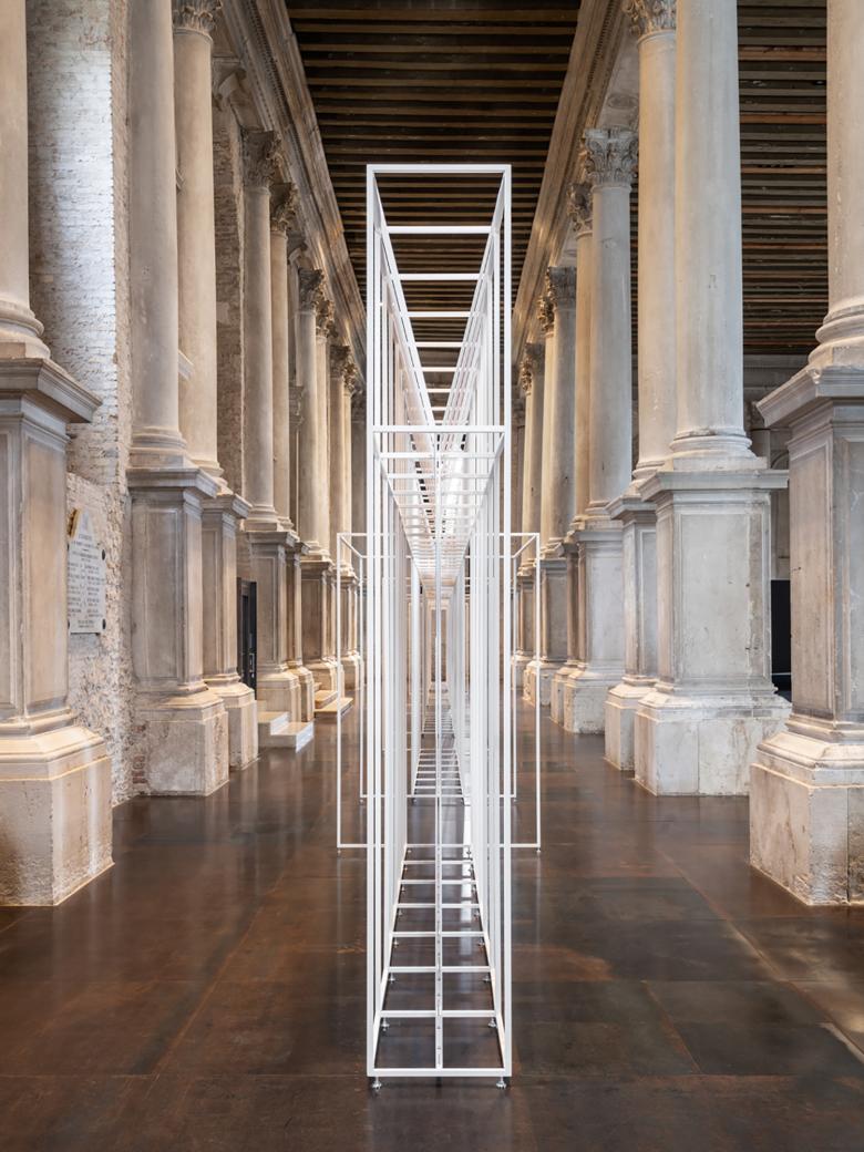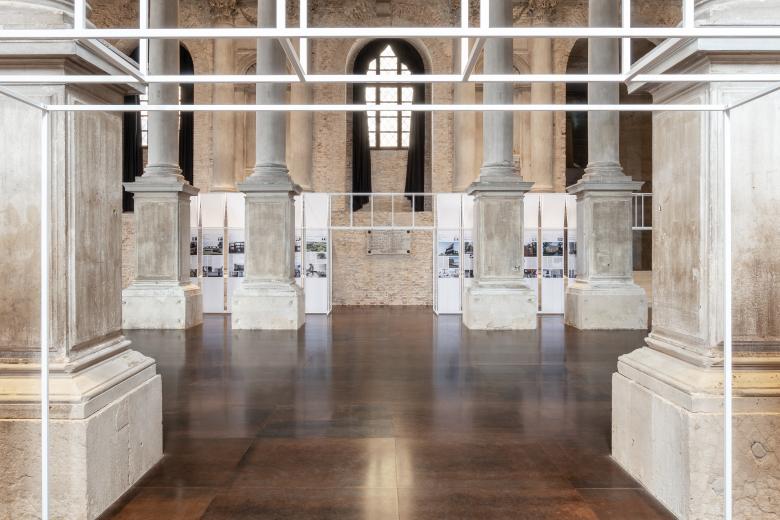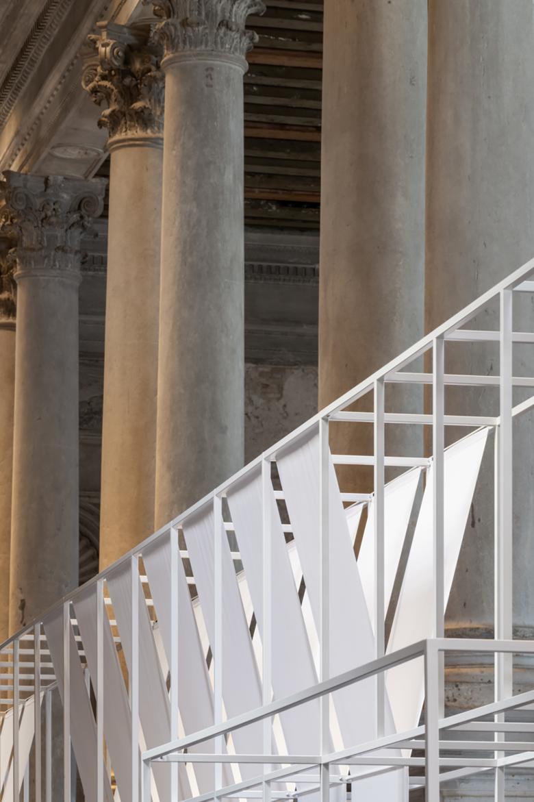 The height of the installation reflects the height of the base of the pre-existing columns, creating a direct relationship with the context, between the heaviness of the stone and the lightness of the exhibition structure.