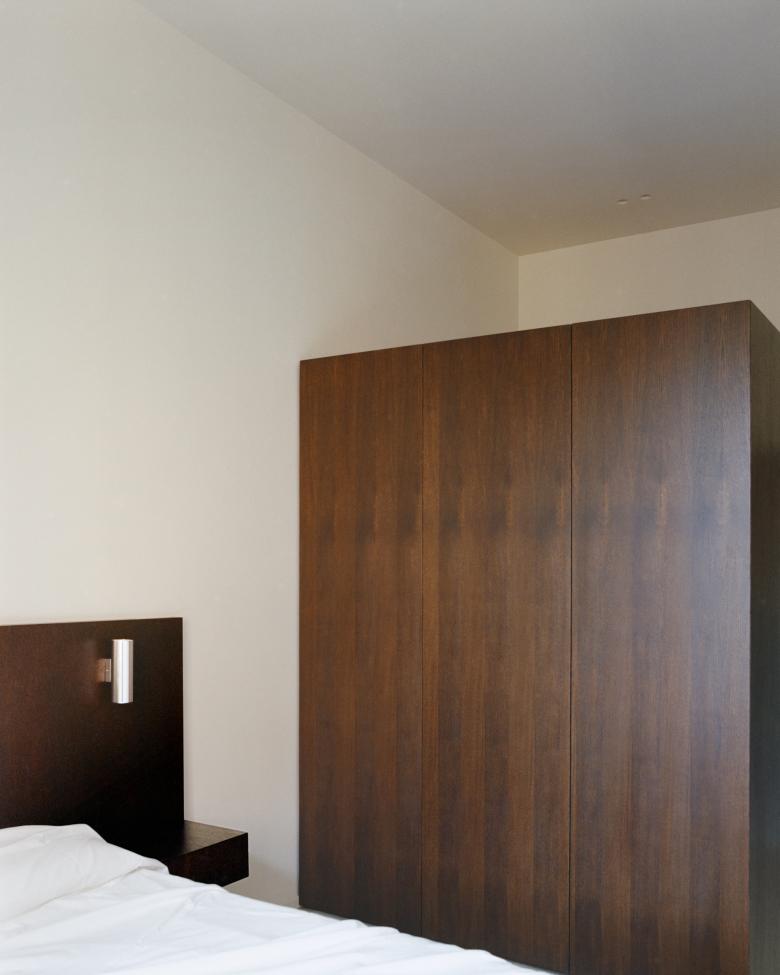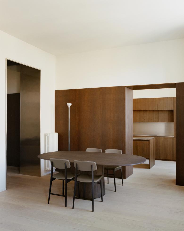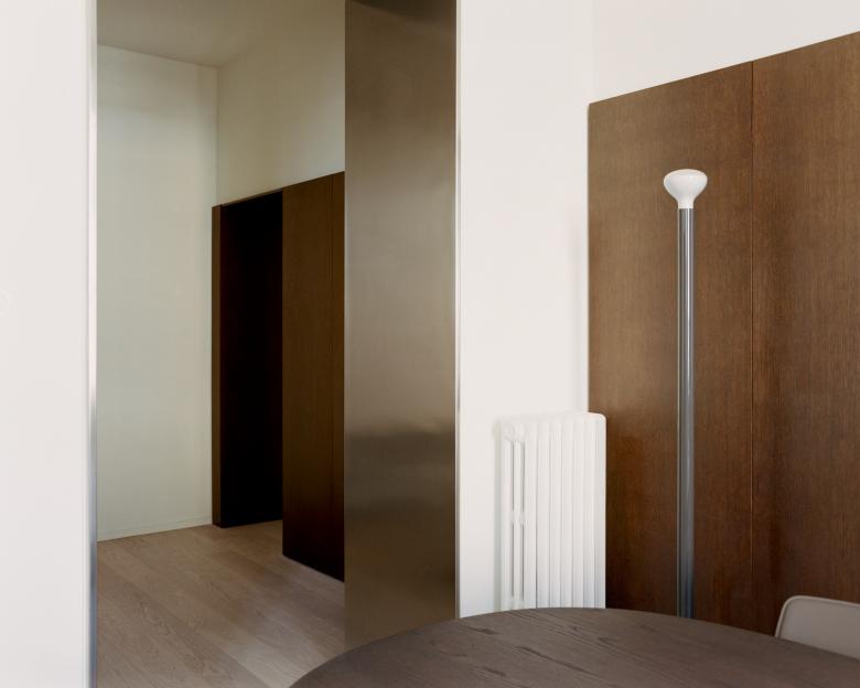The design solution was to use dark walnut wood as the common thread of the entire project, creating a domestic infrastructure based on a system of custom-made furnishings such as wardrobes, boiseries, kitchen, bathoroom cabinets, etc.