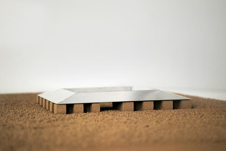 The materials used for the facade are local sand-coloured compact sandstone, while an aluminum sheet cladding with a bronze-effect finish was chosen for the roof, recalling a material with a strong historical value and which guarantees chromatic continuity with the landscape.