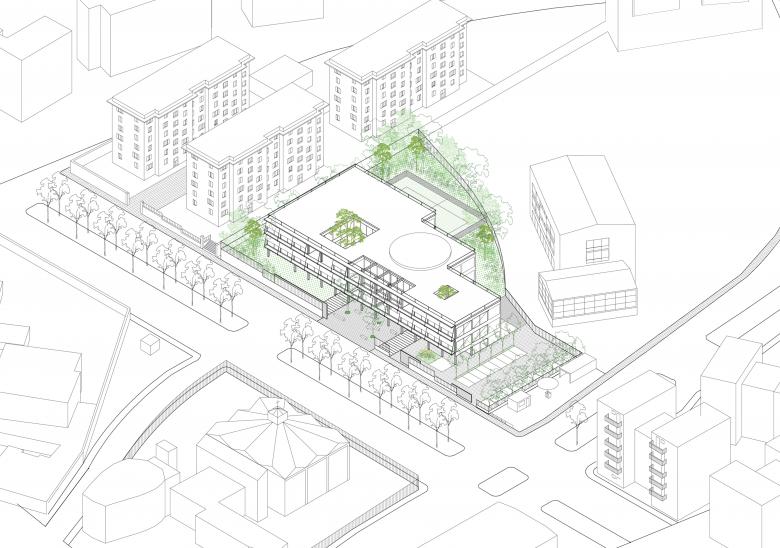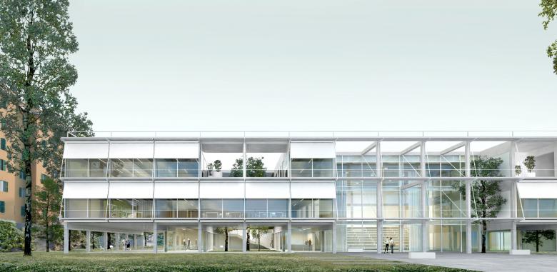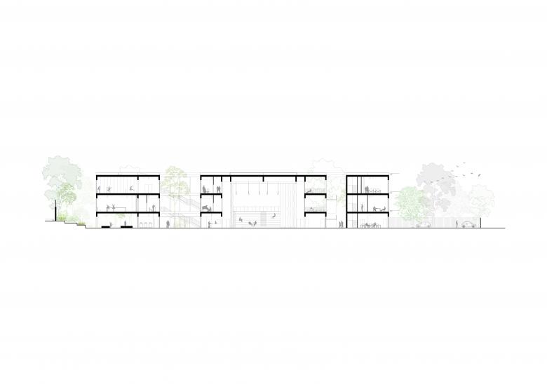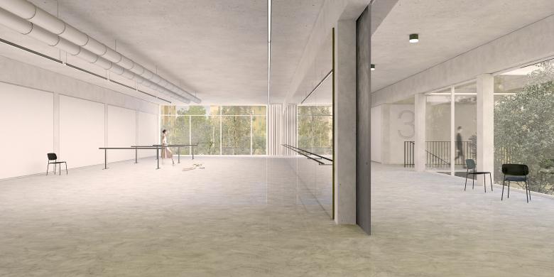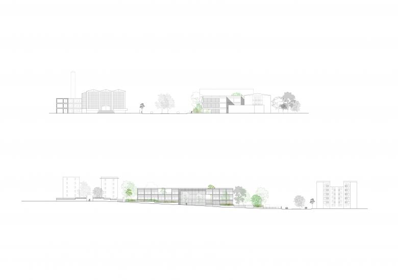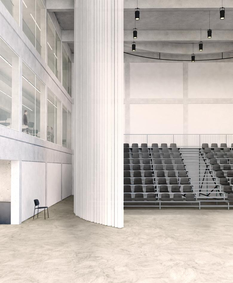 Recalling the large scenographic and transformable spaces of film studios, the building with simple geometries shows itself in its essence, enhancing the skeleton of a flexible structural frame, open to the social development of the city.