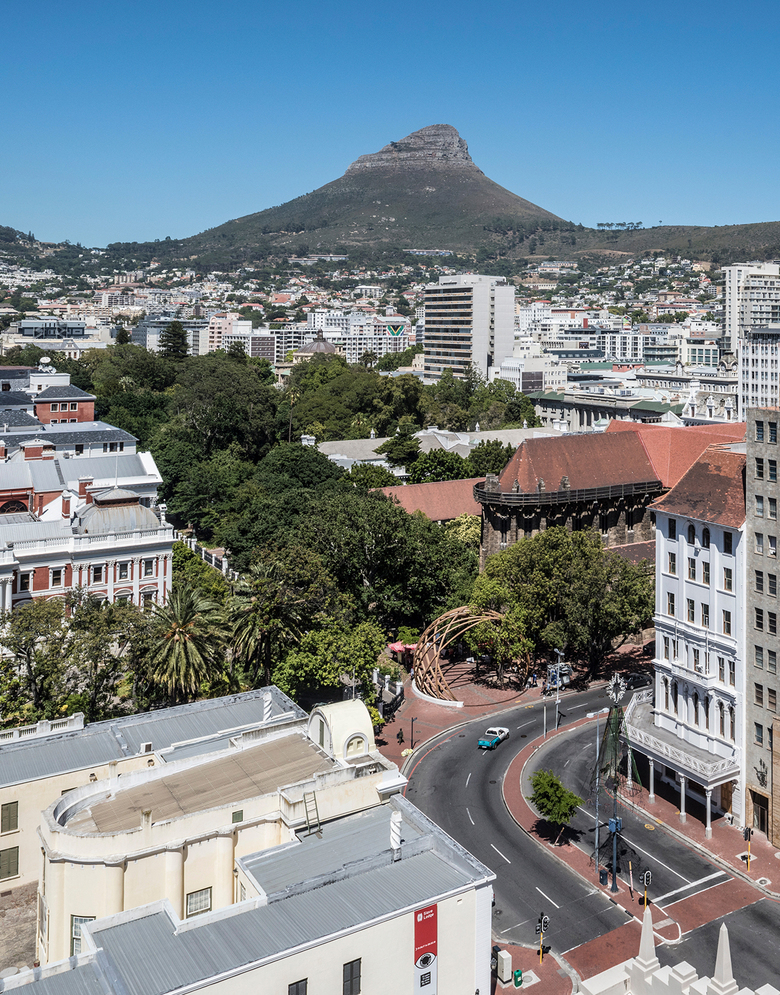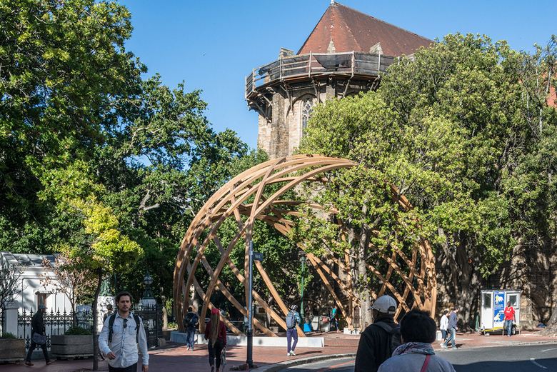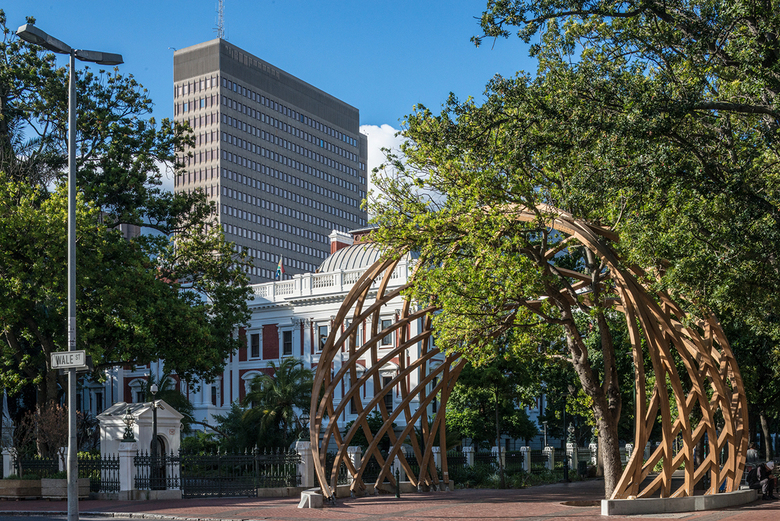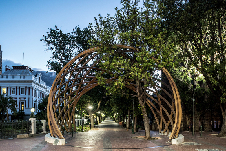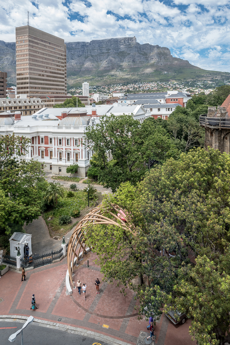 Designed by Snøhetta and Johannesburg-based Local Studio, in collaboration with Design Indaba, the engineers at Hatch, and generously supported by Liberty, the Arch marks the site where Tutu began many of his Anti-Apartheid protests in Cape Town. Situated between the Parliament and St. George’s Cathedral, the permanent wooden structure creates a new public space in the city’s downtown. The Arch’s significant location will stand as a constant reminder to lawmakers. Its proximity to St. George’s Cathedral, which is the seat of the Archbishop of Cape Town, frames the public entrance to the Company’s Garden that has been in existence since 1652, and is the most popular walk for citizens accessing the cultural precinct of Cape Town.