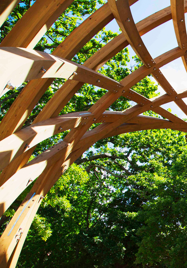 The Arch consists of 14 intertwined strands of bent wood, representing the 14 chapters of the South African constitution. Together the arching wooden elements inscribe a globe, celebrating Archbishop Tutu’s role as a unifying figure for the international peace movement. At 9 meters tall, or nearly 3 stories high, the scale of the Arch envelops visitors as they pass underneath it.