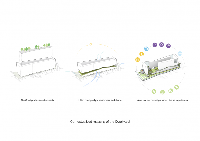 Framed by a central courtyard and complemented by a network of pocket parks, the landscape offers something for everyone as a social condenser. Sports courts and playgrounds cater to younger visitors, while therapy gardens and rest pockets serve older generations. Cultural spaces, meanwhile, provide a stage for community gatherings and events. By clustering these active, playful, and mindful zones, the design fosters intergenerational and intercultural exchange.