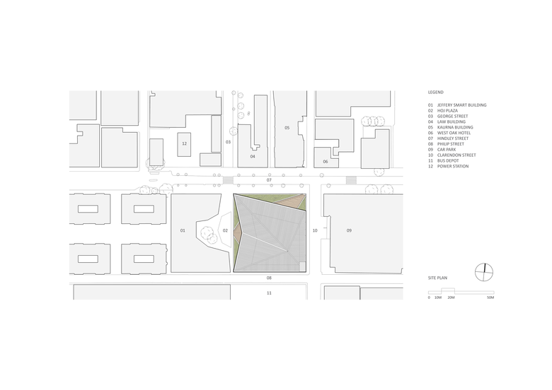 The interaction between the landscape and the building offers passersby a snapshot of the life inside Pridham Hall and creates a welcoming façade to the campus which enhances activity occurring both inside and outside the building. At the north-eastern and western sides of the building, the roof extends down to street level to create two terraced green recreation spaces which function as large external public amphitheaters. These flanked “green wings” are designed to produce an exceptional display of textures and colors, showcasing the plant species from Southern Australia with emphasis on those from the Adelaide region. Creating a dedicated social space, the western amphitheater is integrated with the adjacent buildings with opportunities for outdoor cinema and events. The north-western corner of the building is lifted, highlighting the main entry and Pridham Hall’s connections with the urban realm.