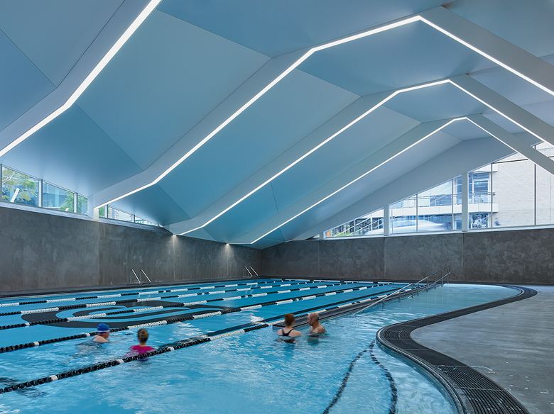 UniSA Sport is situated at the basement level and offers a gymnasium, dance studio and a unique 25-meter swimming pool. Vertical connection between these spaces and the ground floor is created by the use of glazed voids between the street and the lobby where views and daylight are able to penetrate with maximum effect.