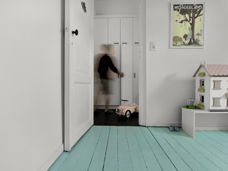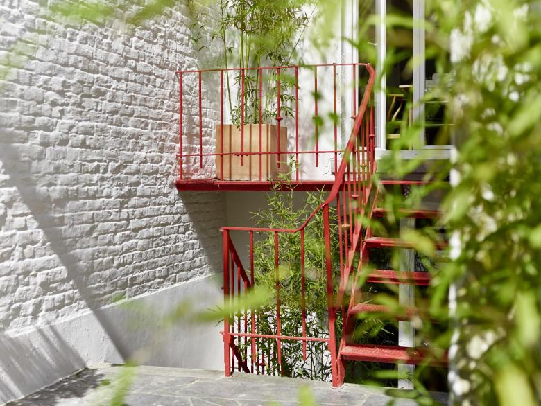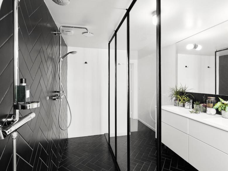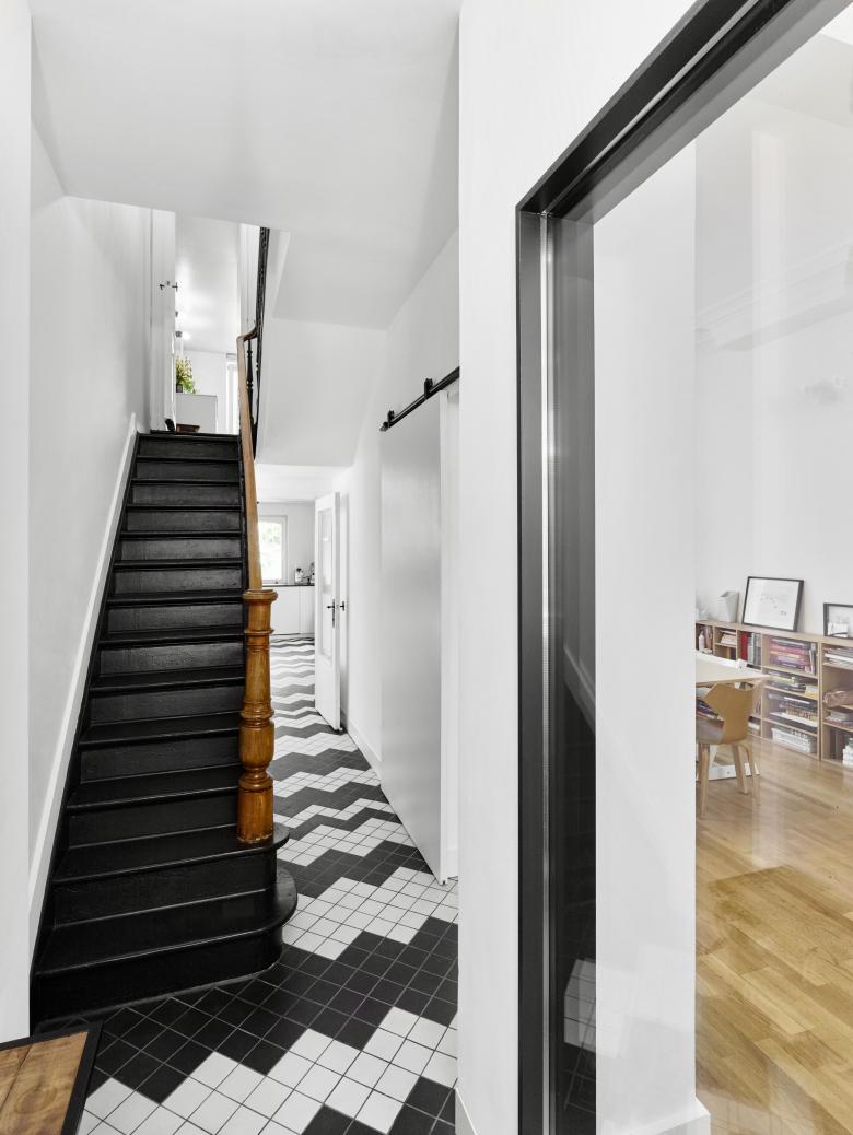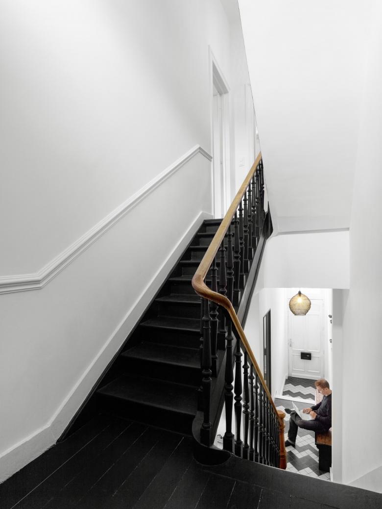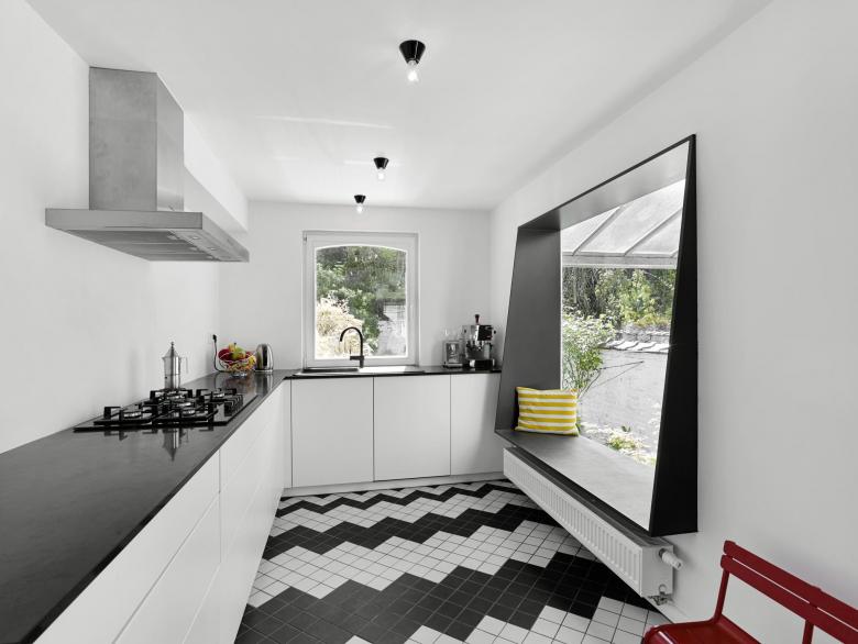 Complete renovation and refurbishment of a 19th Century house in Brussels, Belgium. The clients - a family with children - wanted the design to reflect their passion for colours, light and space. Black and white graphic pattern tiling was added throughout the ground floor level, with sliding and glass doors maximising the natural light and available space. In the kitchen a custom picture window/bench brings the outdoors - indoors. Colour is used innovatively with a dark paint bringing focus to the original feature staircase while on the upper level bright painted floors create contrast between rooms. In the bathroom a new double walk-in shower and black herringbone tiling transforms the space.