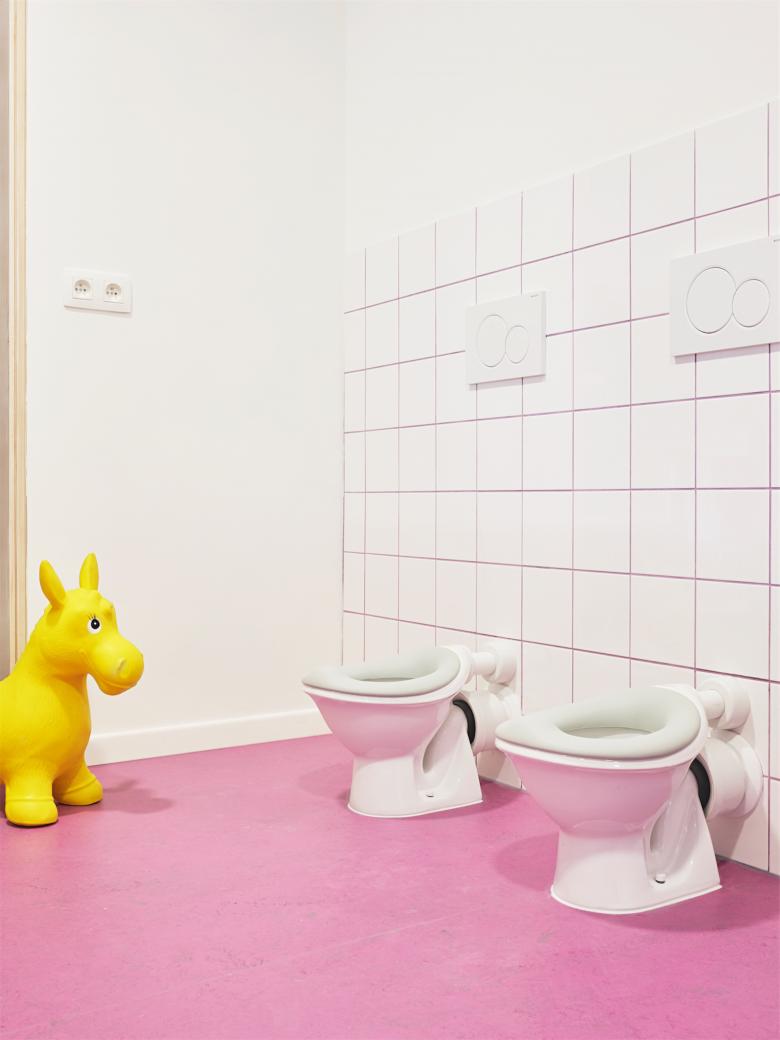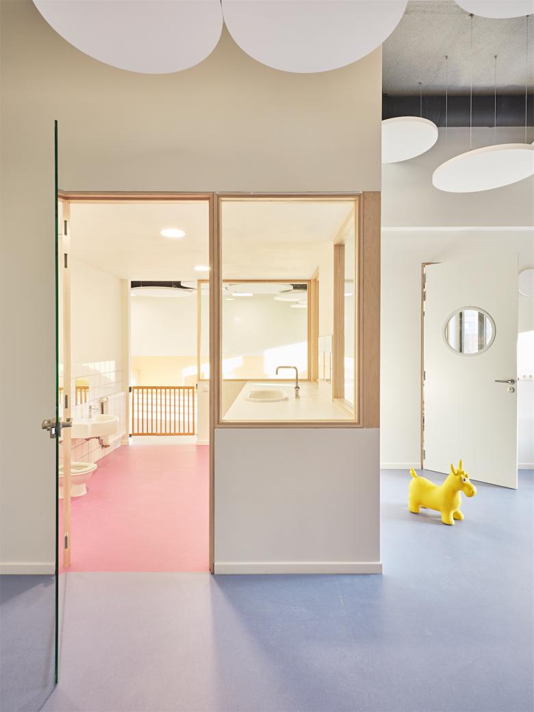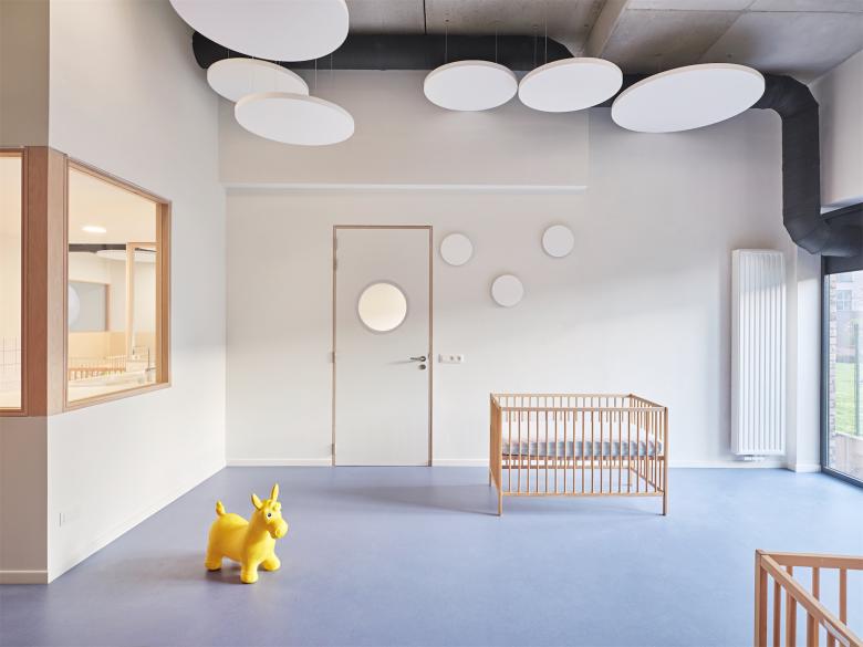 Creation of a day care centre/creche in Brussels, Belgium. Adaptive re-use of a premises keeping the industrial integrity. Coloured flooring and glazed panels zone the space while maximising natural light and visibility. Audio reducing discs on ceilings and walls and natural hued paint colours create a sense of calm.