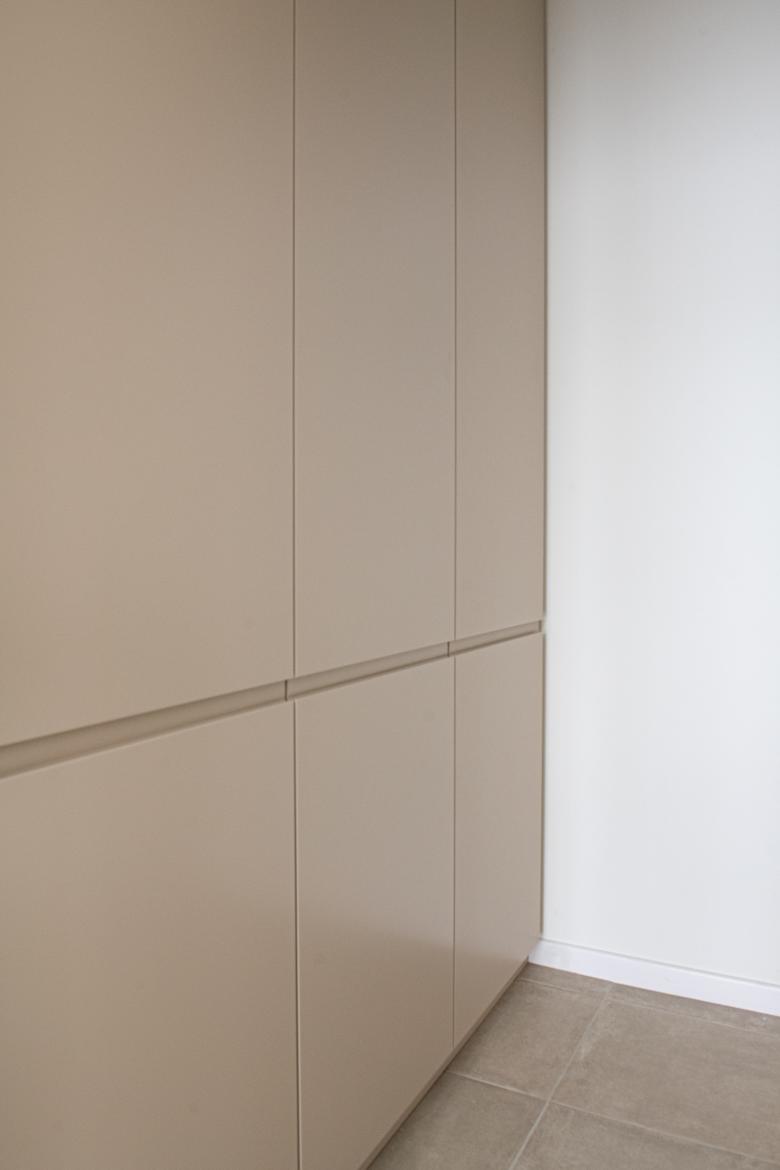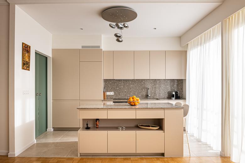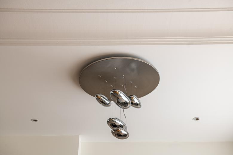 Renovation and space re-design of family apartment in Brussels, Belgium. Creation of a kitchen/living space with a new minimalist kitchen, a utility area screened behind frosted glass doors and statement light fittings.