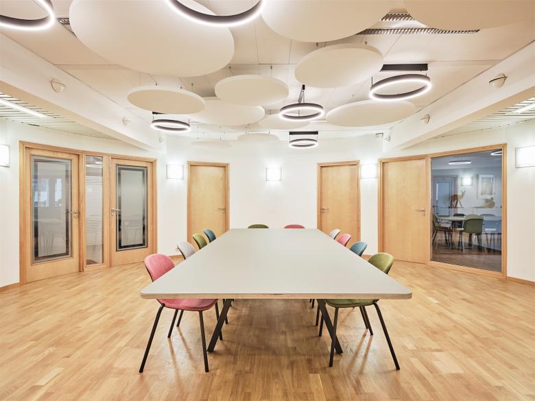 Space re-design and refurbishment of Oslo Region Workspace in the European Parliament, Brussels. Communication of Oslo Region's brand through the space with a logo wall mural, carpet mosaic and furnishing in complimentary colours. Commission/design of custom furniture for reception table and kitchen/coffee bar area.