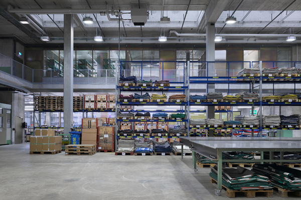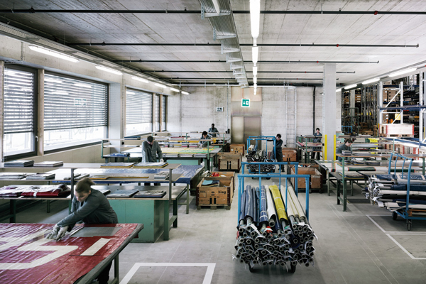 The Freitag factory in Zurich-Oerlikon is housed in the Noerd commercial building designed by Rothen Architektur in 2010. In addition to built-in production facilities and offices for design, logistics and administration, five open floors encompassing 10,000 square metres accommodate over 120 employees. A company canteen and a factory shop have also been added. The heart of production is the newly developed, ecological rainwater-operated industrial washroom in the basement.