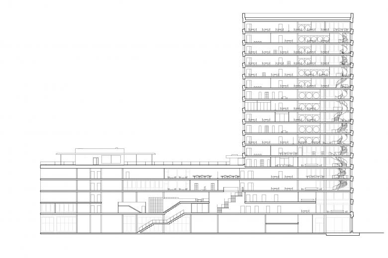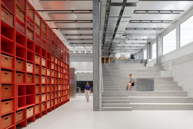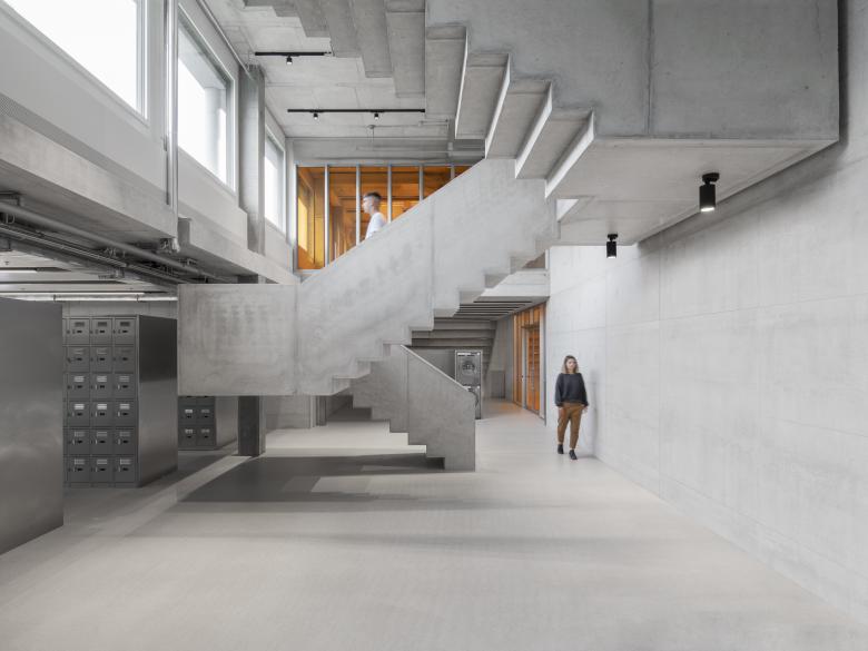 A reception area with an integrated café and shop is located on the ground floor. One floor up, a generous two-storey space for meeting and co-working is open to external visitors, thus establishing a connection to the surrounding city.